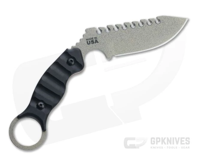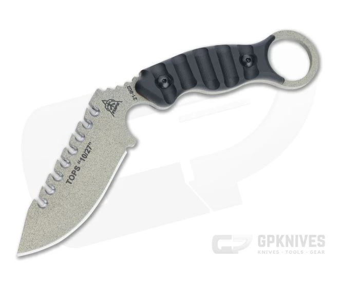 From the Heart of the Rocky Mountains, USA comes a beast unleashed by TOPS Knives known simply as the 10/27 Karambit. Inspired by the iconic Filipino ring knife, the 10/27 provides a utilitarian backup option with the saw tooth spine and classic clip point profile of a tactical field knife. A Tactical Stone powder coat on the carbon steel blade provides discreet use and corrosion resistance, while the Rocky Mountain Tread black G10 scales offer a secure grip with or without using the ring end.