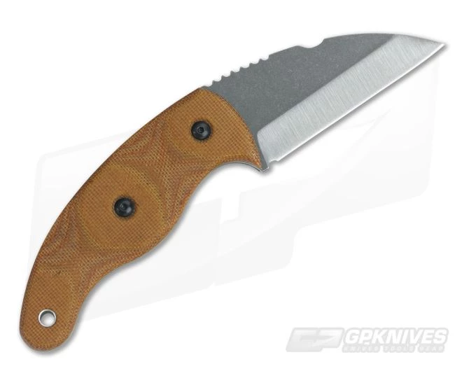 Handle:Â The tang construction is supports contoured, natural canvas Micarta handle scales that offer durability and traction with contrasting black liners for a very handsome look. Jimping on the spine paired with the negative blade angle and ergonomic handle design deliver a high level of control and power in a compact, sub-4oz. package. Two allen bolts attach the scales with hollow aluminum tube provided for lanyard attachment.