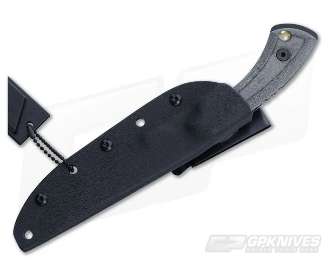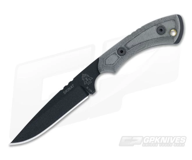 TOPS Skinat makes for an interestingly unique hunting knife. Tough black traction coated 1095 tool steel blade is long and thin for easier cutting. Sharp looking black micarta handle scales are bolted on over red liners and provide for a comfortable grip in all conditions. Comes with a black Kydex sheath with rotating spring metal clip.