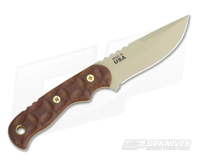 Composed of a full tang of proven 1095 tool steel, the blade has been ground to a drop point useful for skinning as well as utility. Â A tan powder coating has been applied and is useful in protecting the high carbon steel from the elements it is guaranteed to encounter. Â The handle offers comfortable ergos and Rocky Mountain Bull’s eye textured tan micarta handle scales to reduce hand fatigue during long-term use. Â Accenting brass hardware and lanyard tube.